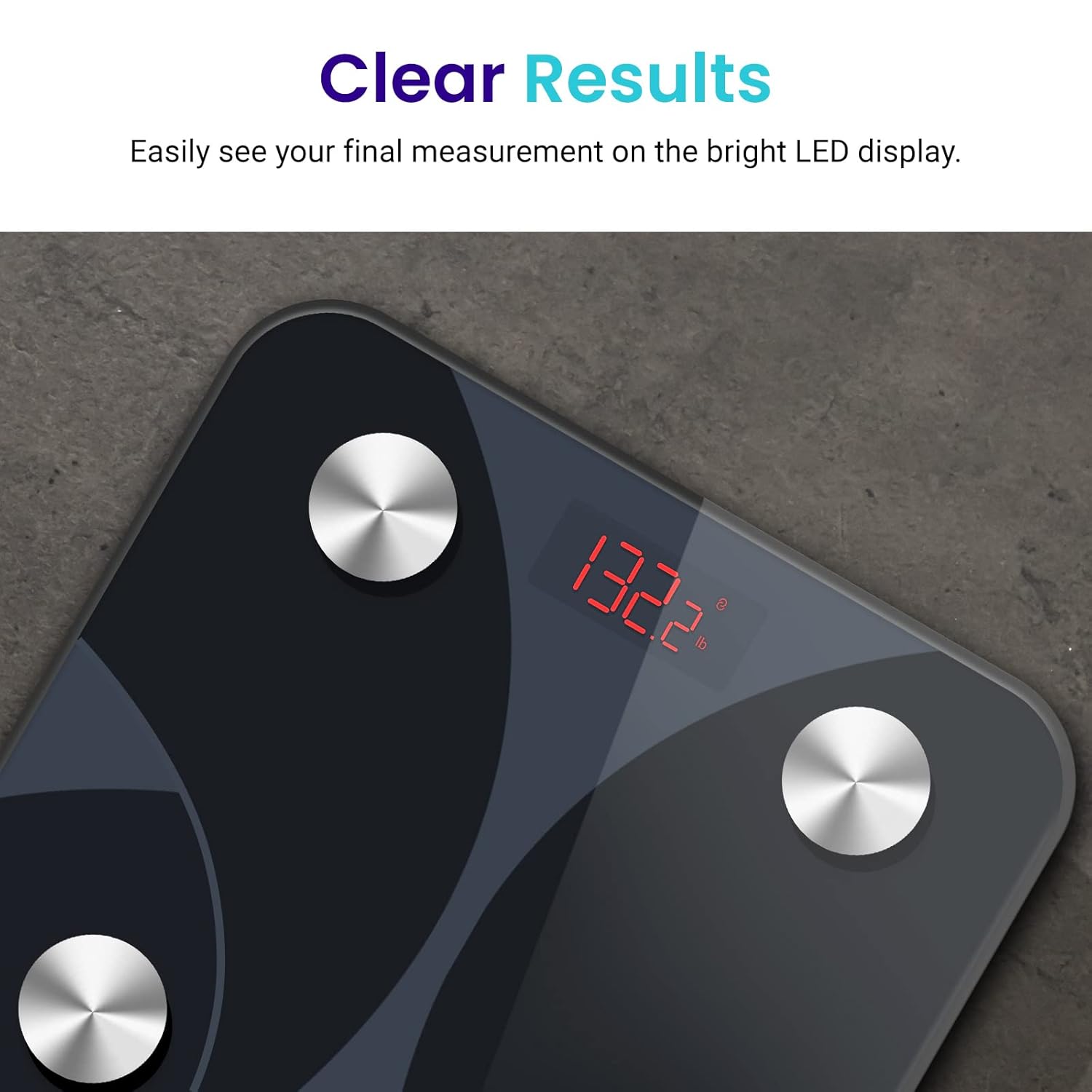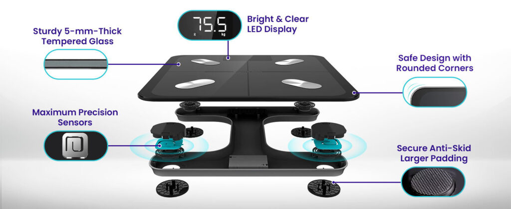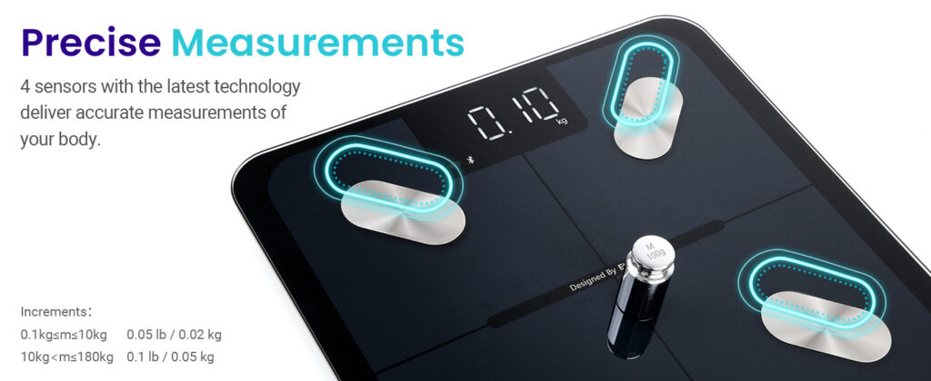 • High Accuracy: 4 high-precision sensors of the smart floor scale deliver accurate weight measurements to 0.1 lb / 0.05 kg increments with a 400lb/180kg capacity