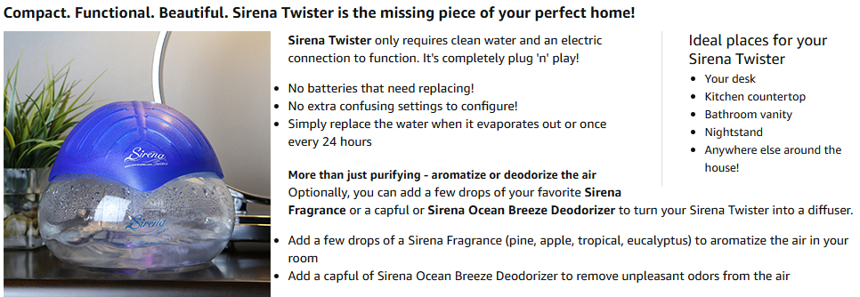 - ✅ Indulge in an aromatherapy experience: Choose the Sirena Fragrance in a pine, tropical, apple, or eucalyptus fragrance and aromatize your room. Boost your focus, freshen up or relax.