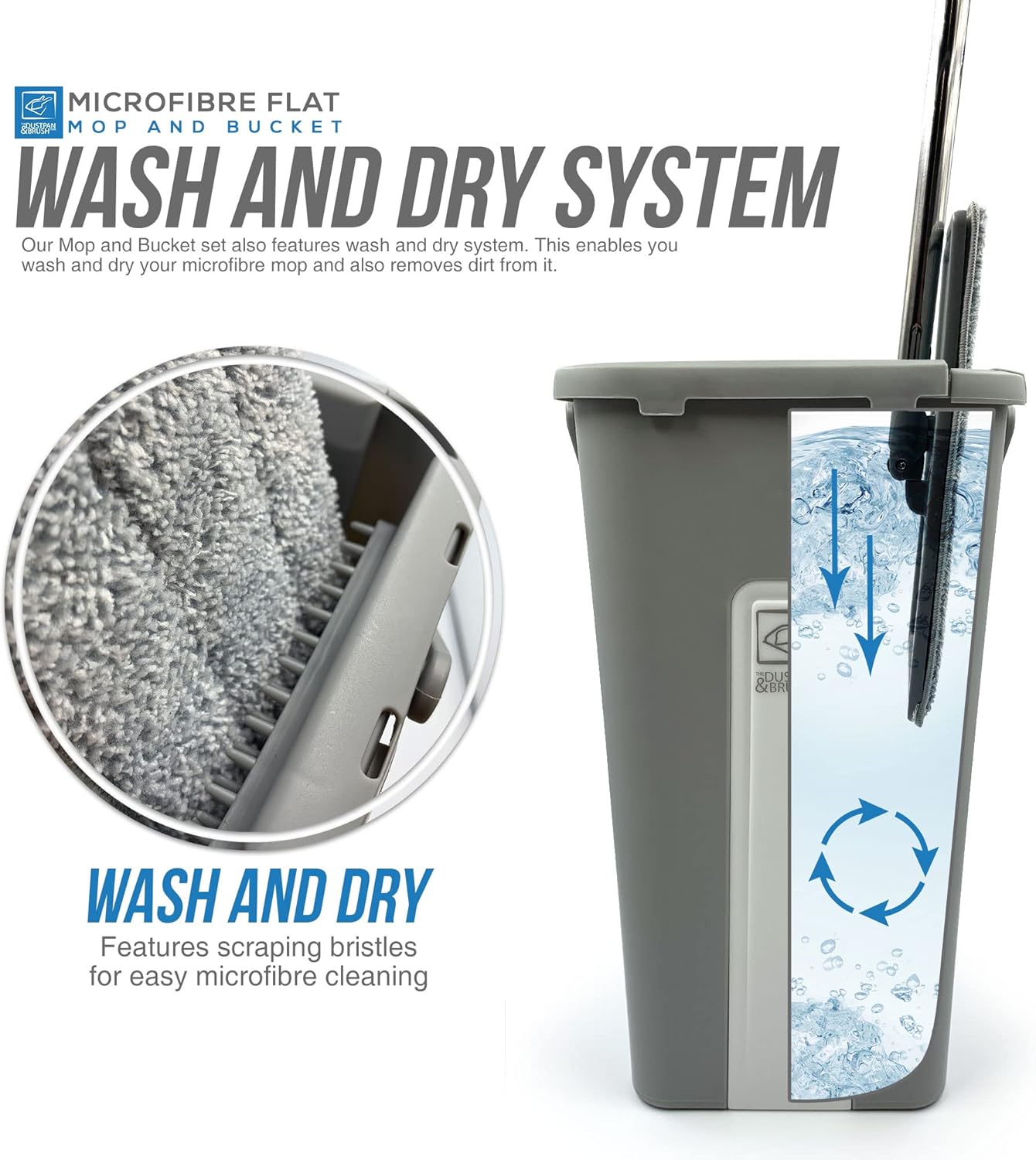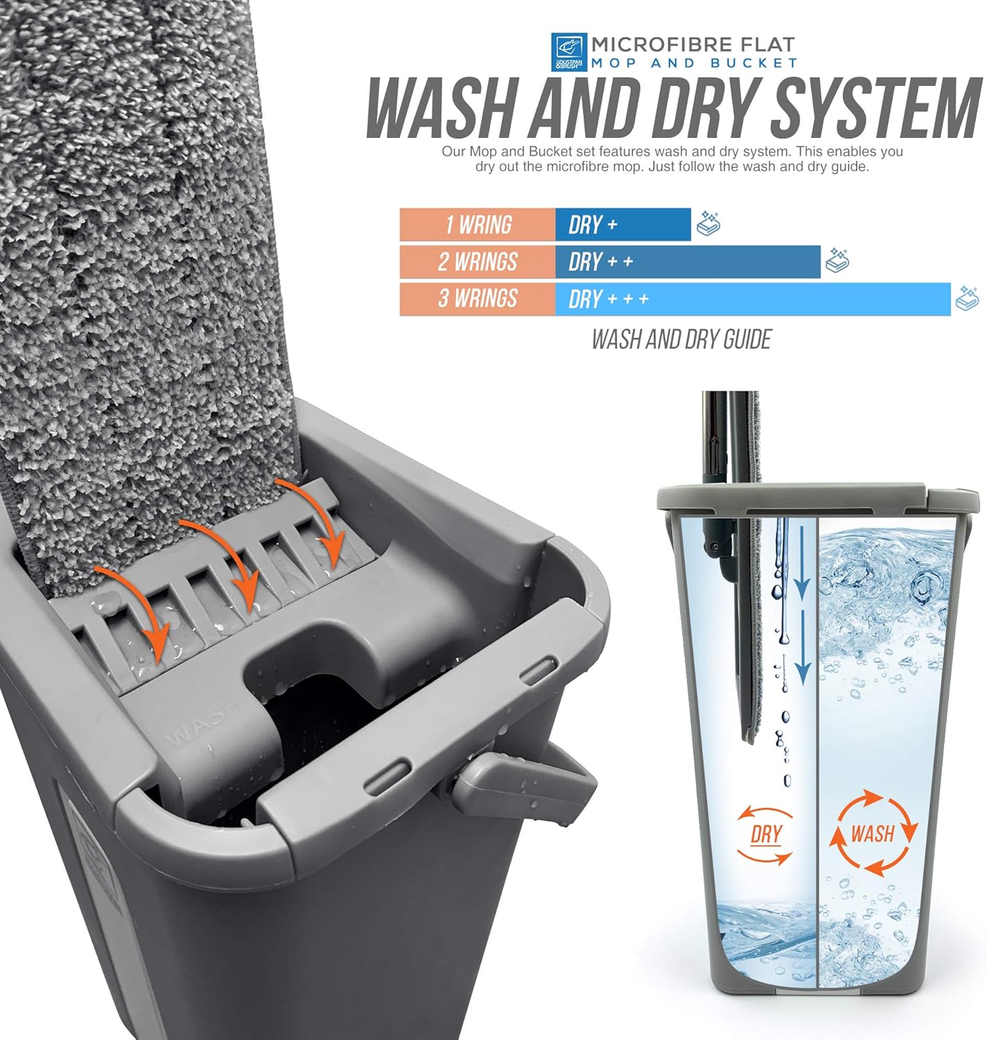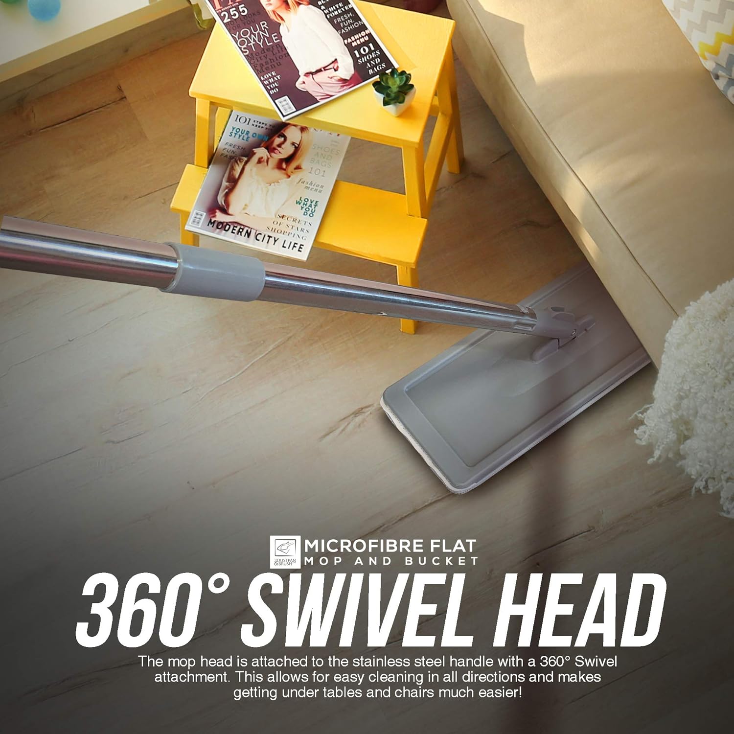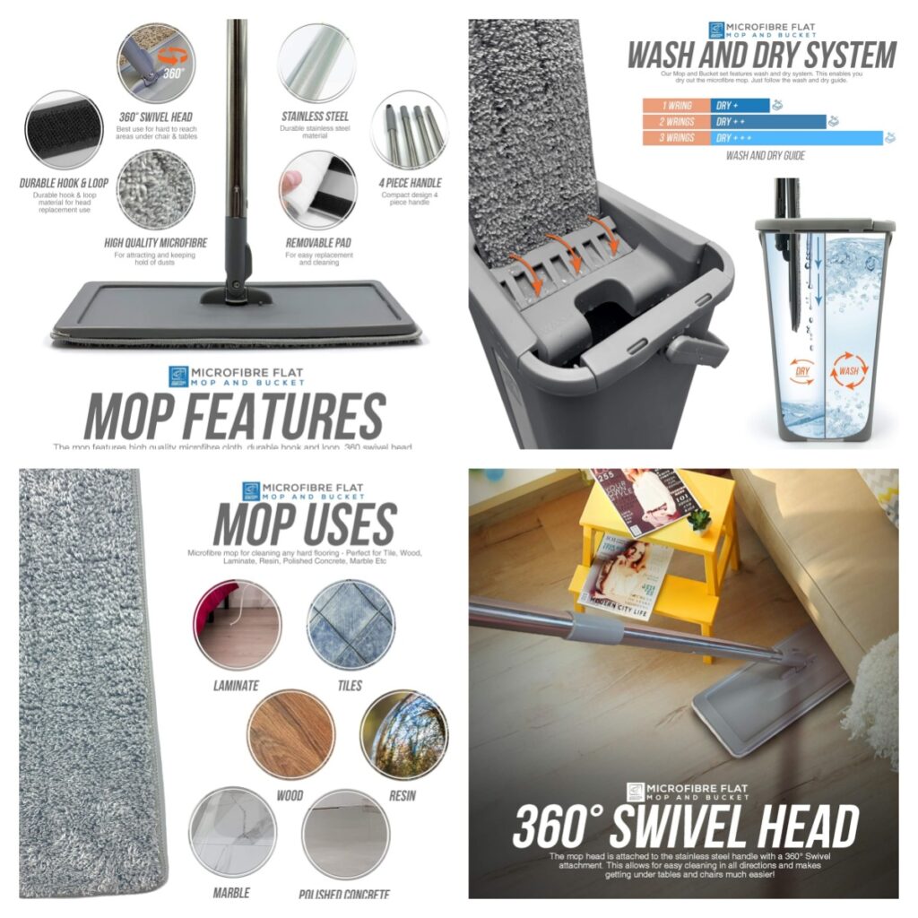 - Floor Cleaner Mop and Bucket Set − This all-in-1 flat mop and bucket feature a wash & dry compartment, which stops excess water from spreading on your floor while allowing quick and easy mopping. Get this efficient mop and bucket set that includes an easy squeeze mop and bucket plus 2 super-absorbent microfibre floor mops replacement pads for every purchase.