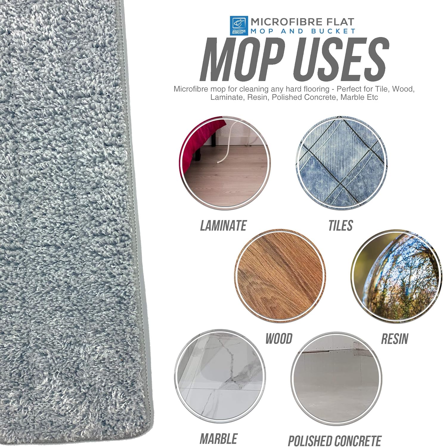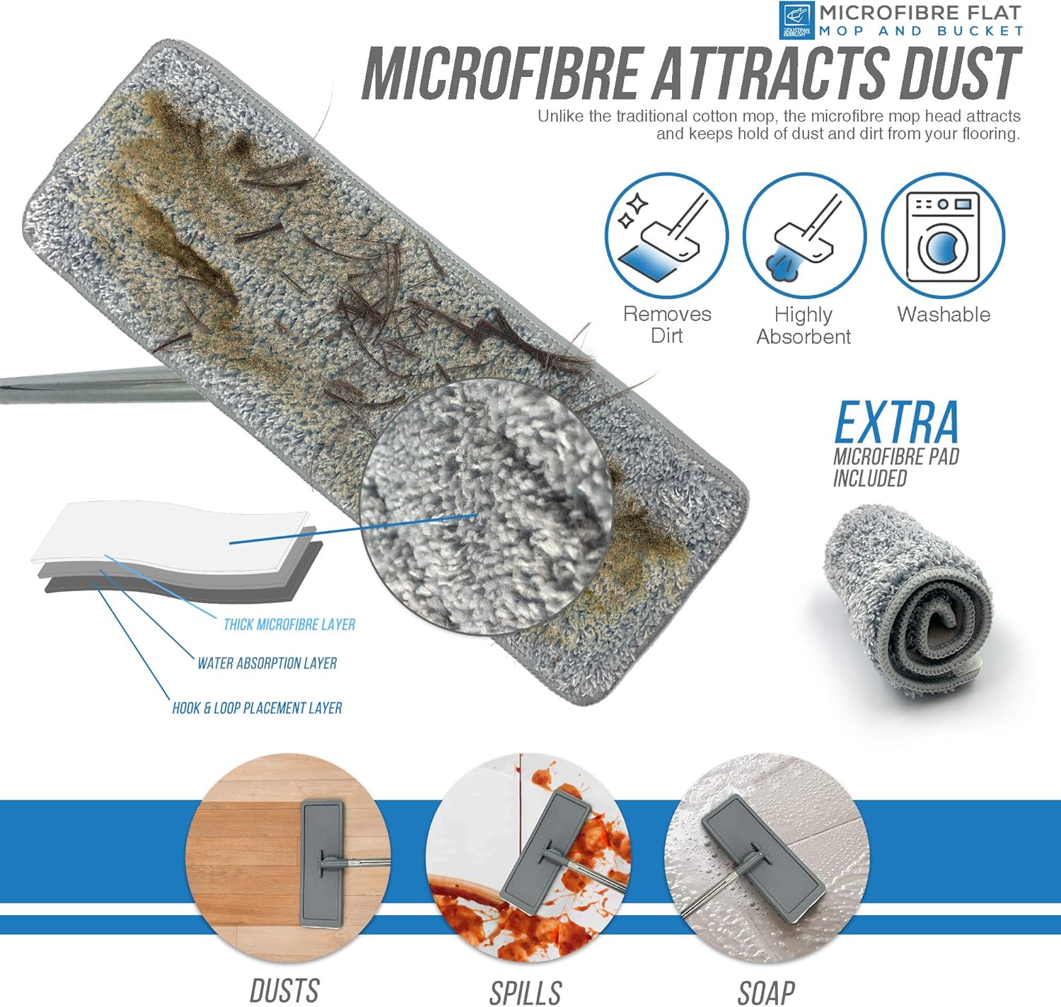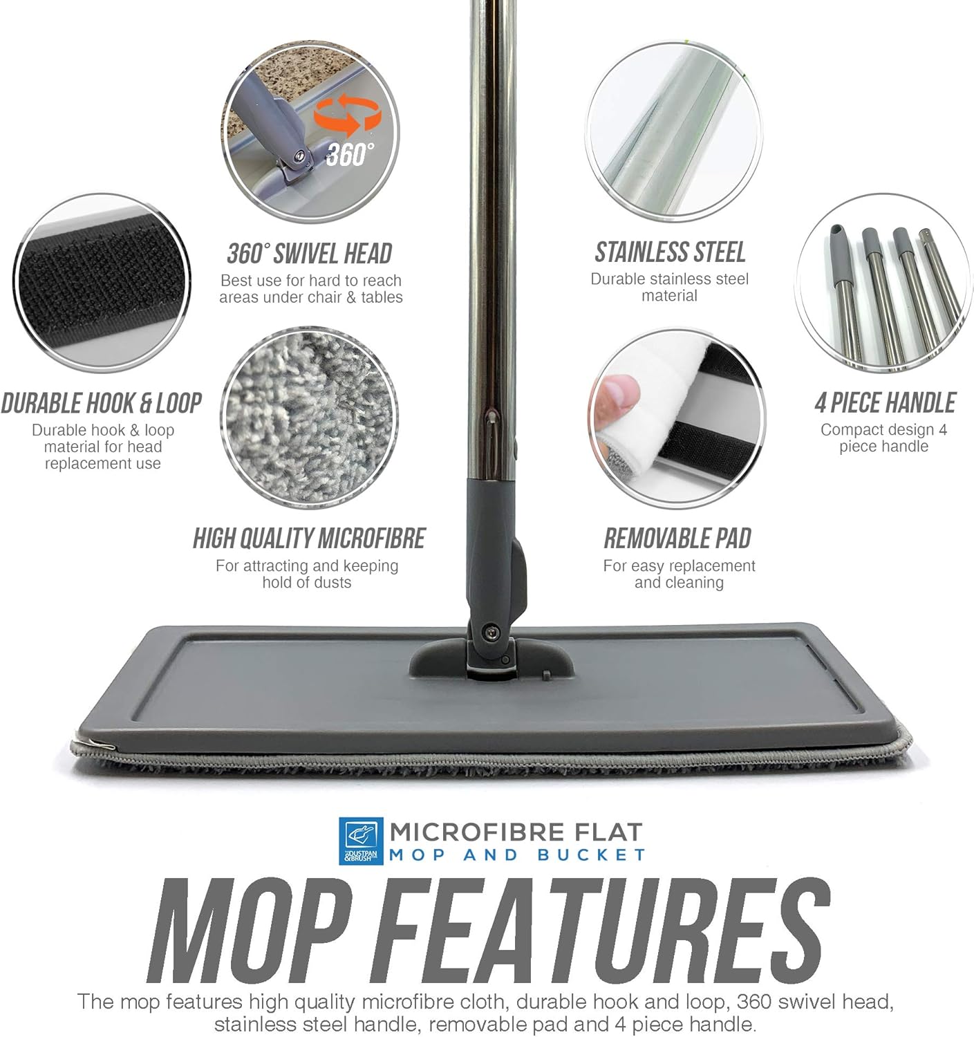 - High Absorbent Microfibre Mop Pads – We all know how powerful microfibre is at cleaning around the home. The flat mop and bucket set features microfibre floor mop replacement pads which are great not only in collecting dirt, dust, hair, and pet’s fur but are also highly absorbent ensuring cleaning and mopping up spills are fast and efficient. The replacement pads microfibre mops for hard floors are easy to remove and can be machine washed.